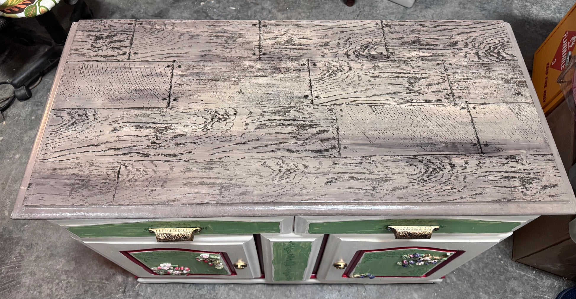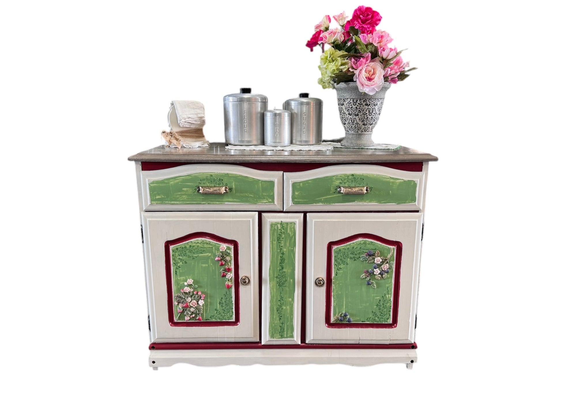 Berry Season Inspired Side Board/Server - Custom refinished mid-century server in a blend of spring colors designed to delight your home space ! Barnwood finish top, cream, red and fresh herb with a serving of strawberries and blackberries on the lower doors. Beautiful copper-finish drawer pulls and door rings. A delightfully happy addition to your home!