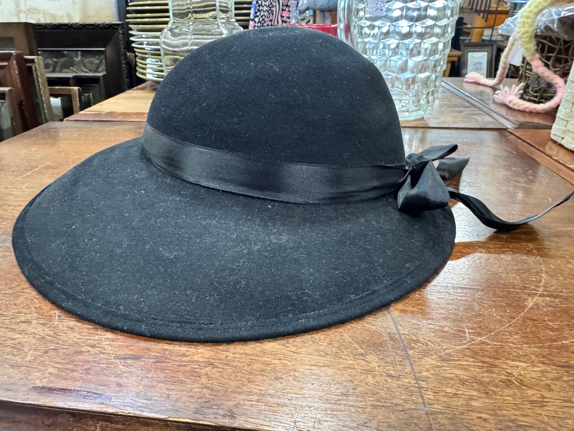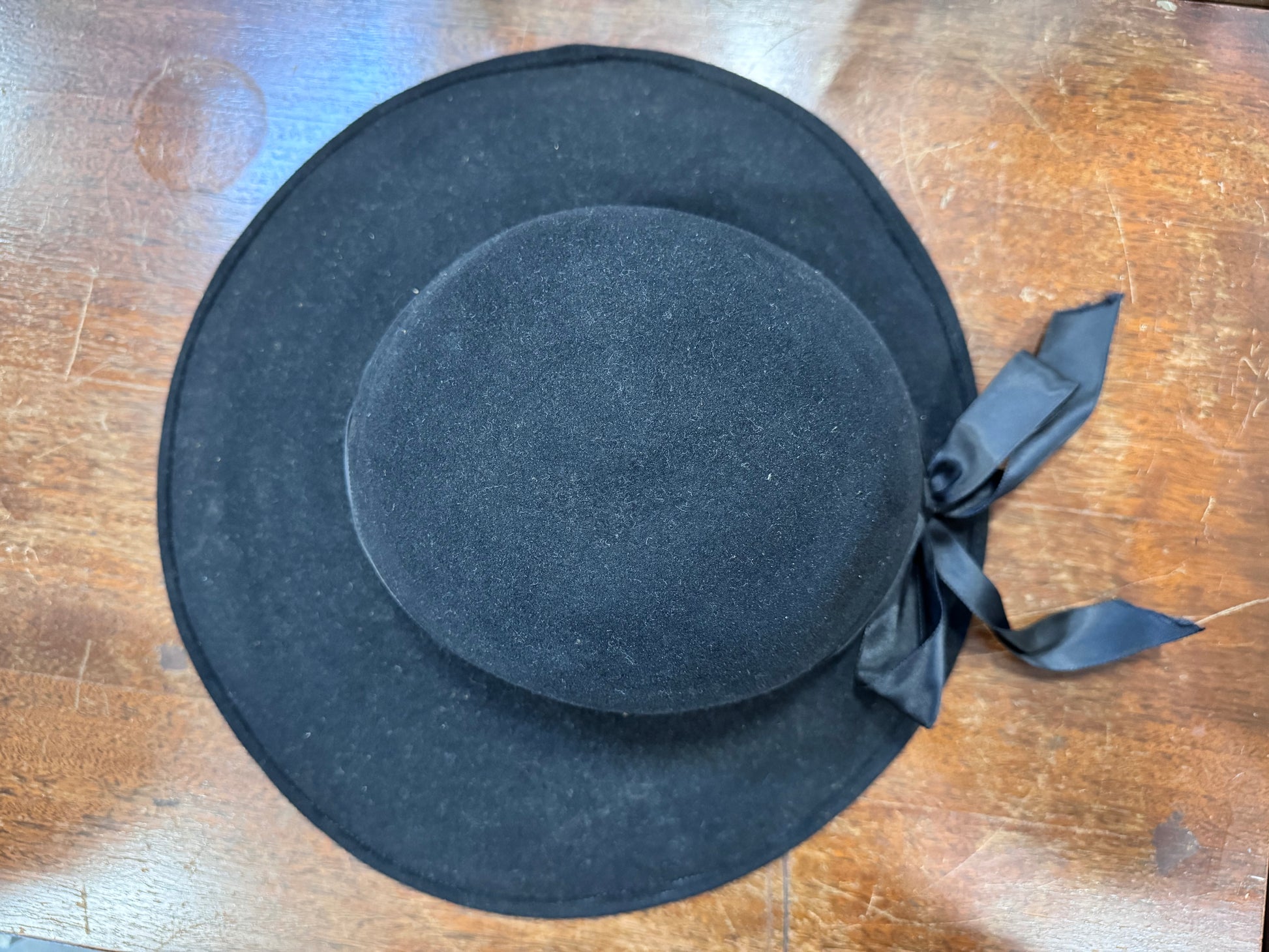 Vintage Black Wool Asymmetrical Hat with Ribbon