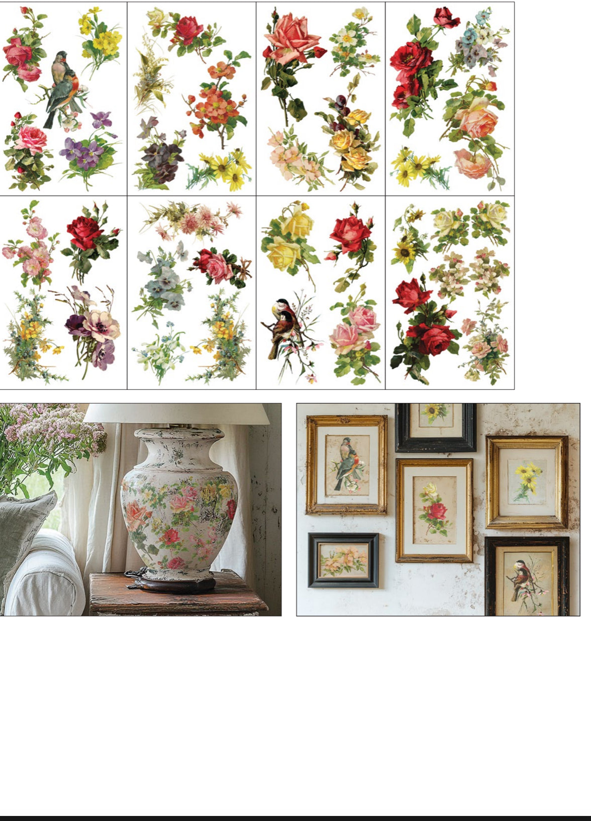 Perfect for floral clustered embellishments on furniture, creating vintage wall art, or small decor like trays and planters, this transfer is as versatile as it is delightful.