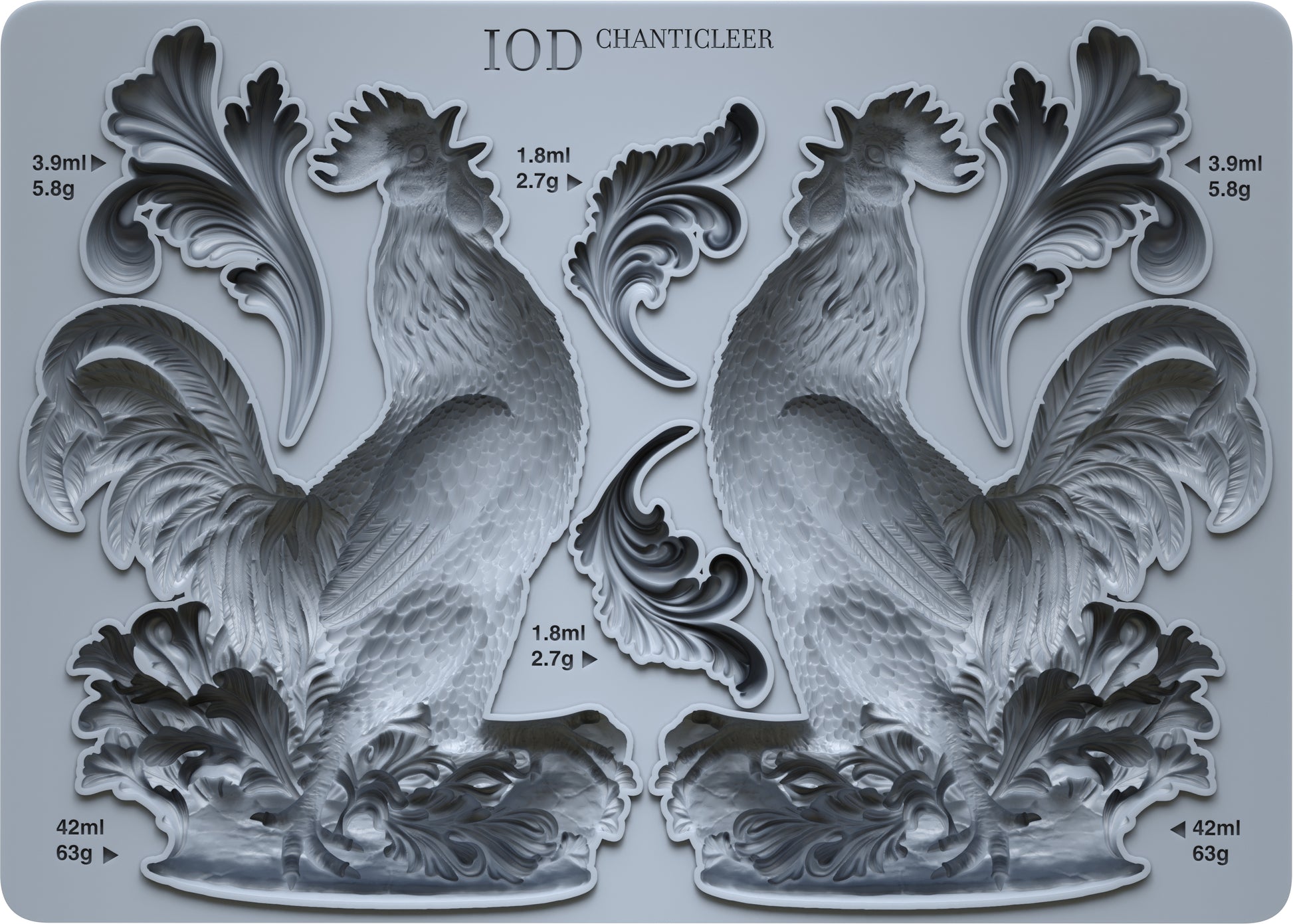 Chanticleer would make a stunning statement on an IOD Arched Wood Blank in a cozy kitchen nook or strutting his stuff on either side of a set of vintage bookends. If you're dreaming up something more grand, Chanticleer pairs beautifully with the Heraldry Mould for an aesthetic that's both regal and rustic. Let him stand strong as a standalone focal point in your projects or serve as a solid base for composing a more grand relief.