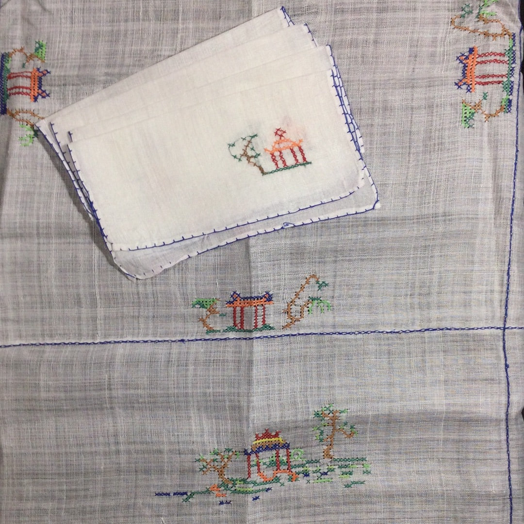 4 linen cocktail napkins and 1 approximately 28” square linen tablecloth hand cross-stitched with Japanese Pagoda theme. Excellent vintage condition.