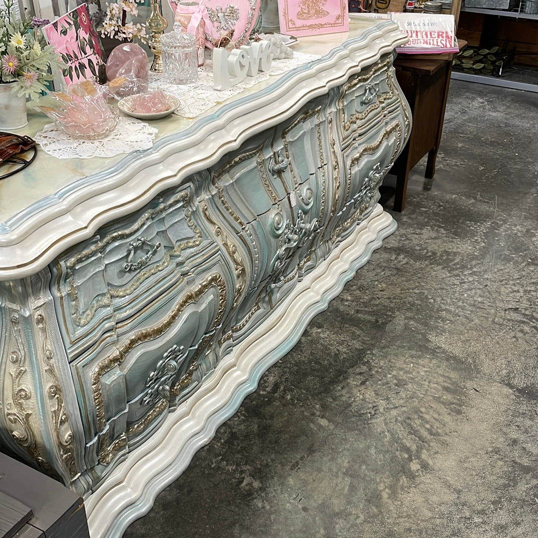 Custom painted French provincial 9 drawer dresser with marble- style finished top. Robins egg blue and gold in color.