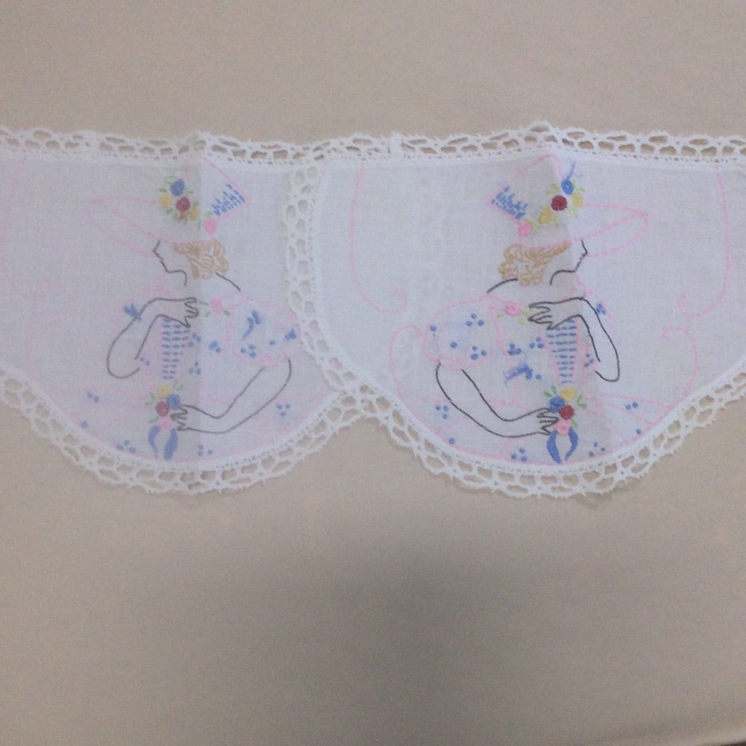 Approximately 11”x8” white linen with crocheted edges, embroidered with Victorian lady in pink. Very good vintage condition.