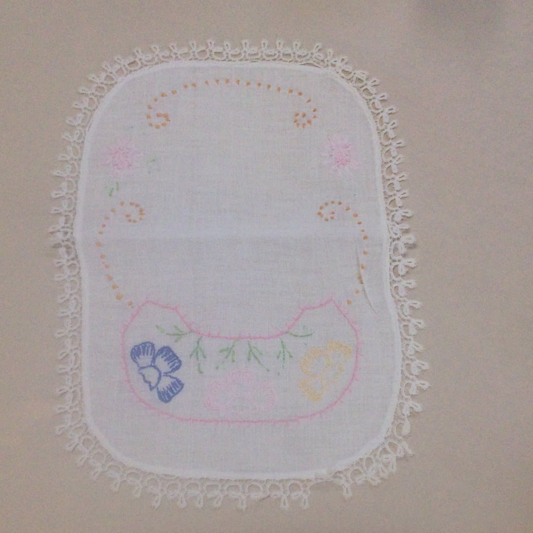 Approximately 13”x9.5” rounded rectangular linen with crocheted edges and hand embroidered with multicolored flowers and yellow dots. Very good vintage condition.