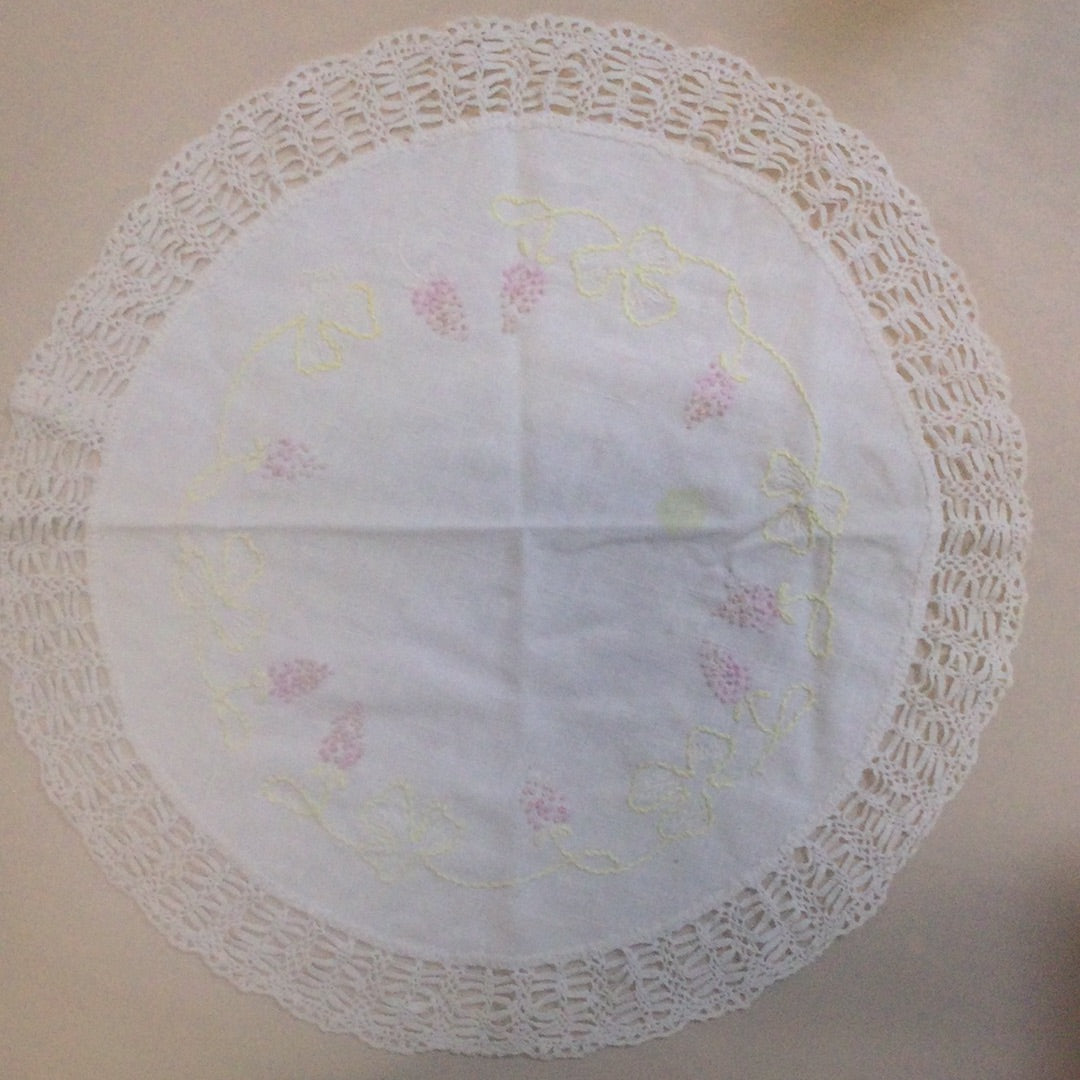 Doily-19” Round, Hand embroidered linen with crocheted edge with.with c