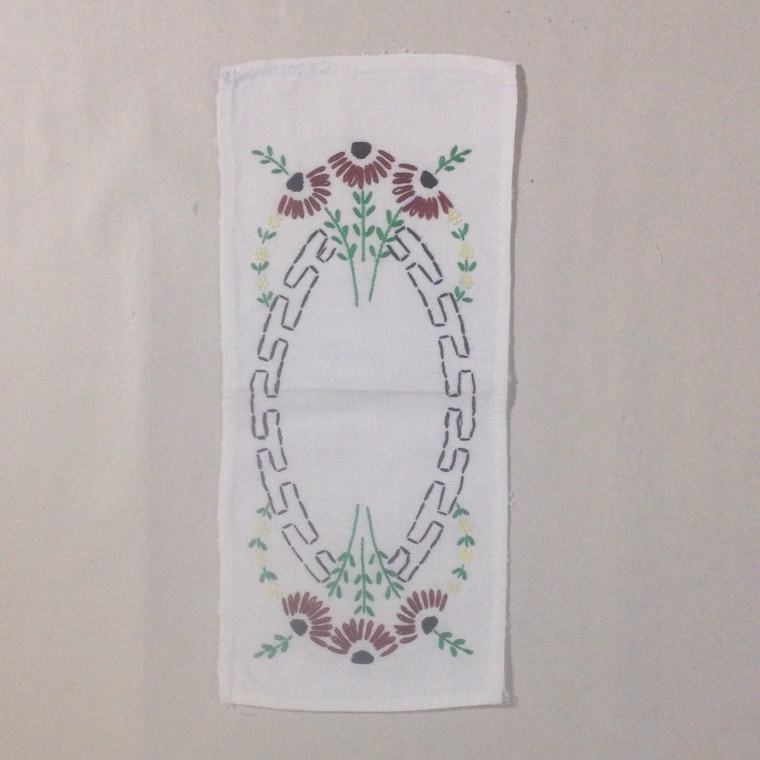 Approximately 11”x5” white linen hand embroidered with dark read and yellow flowers and a black border. Very good vintage condition.