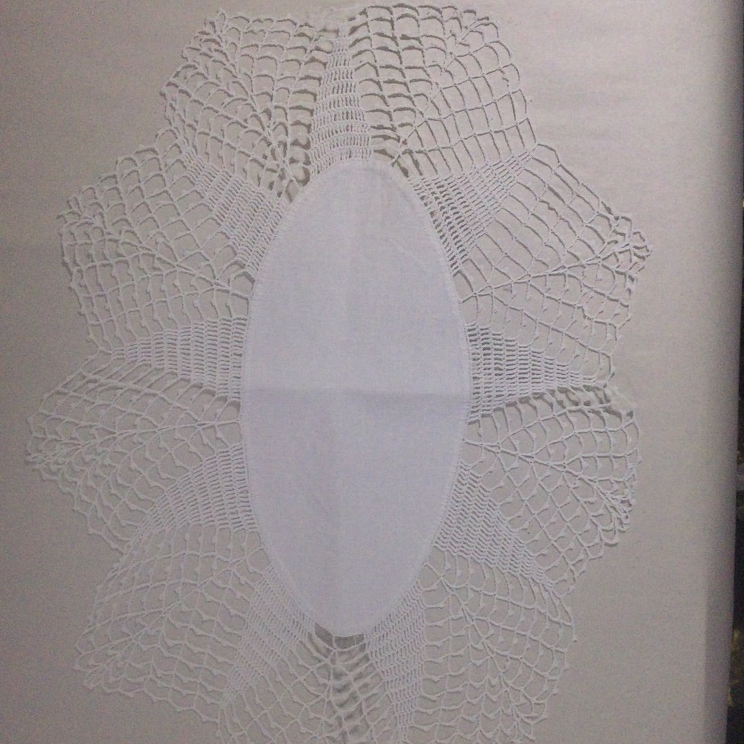 Approximately 18.5x14” white linen oval with hand crocheted leaf border. Very good vintage condition.