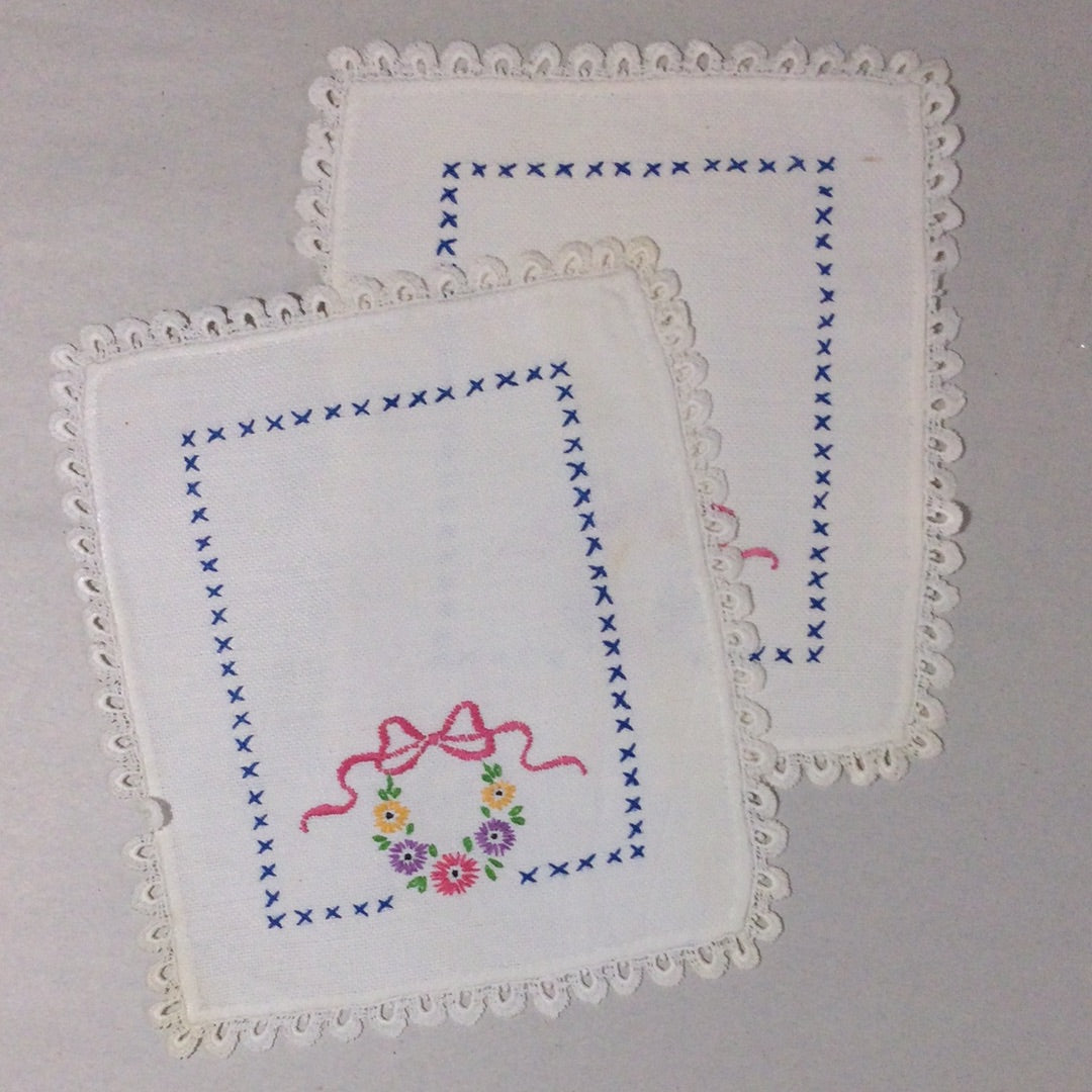 Set of 2 9”x7.5” linen doilies with lace edges, hand embroidered with pink, purple and yellow flowers. Good vintage condition.