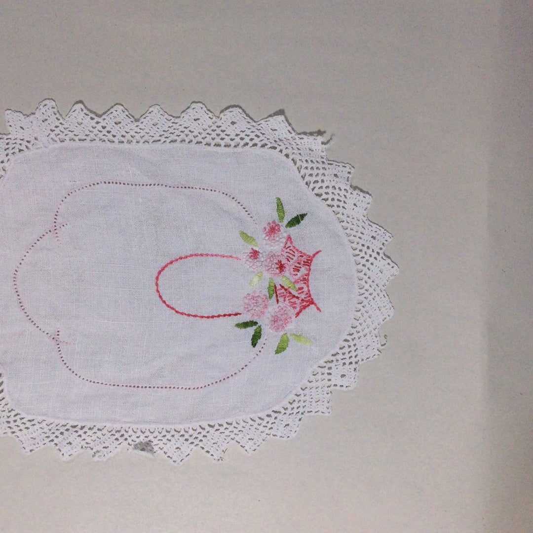 Approximately 9” x 11” white linen with crocheted edge and hand embroidered basket of flowers in pinks. Very good vintage condition.