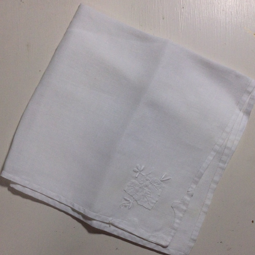 Single white on white embroidered linen dinner napkin. One tiny pinhole. Very good vintage condition.