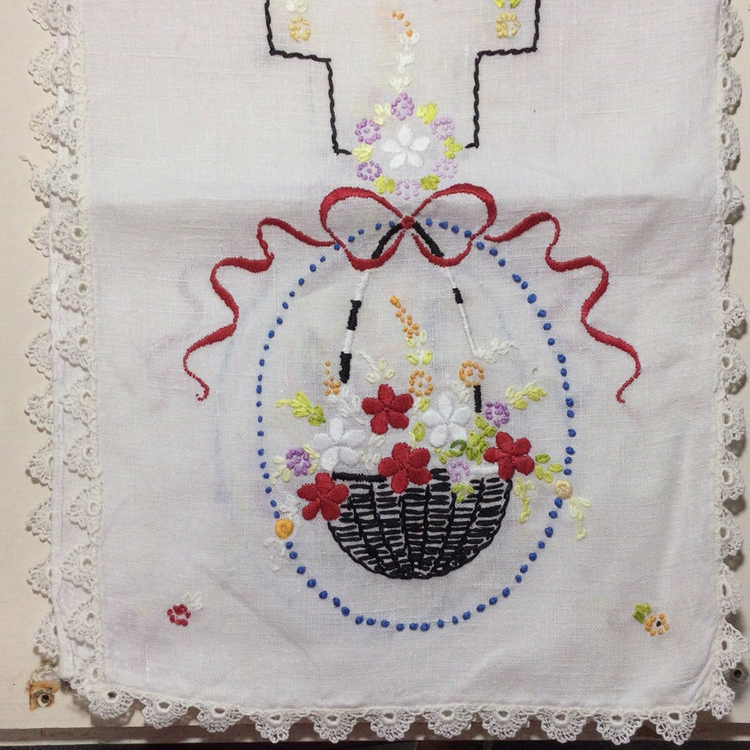 Approximately 11”x 38” linen table runner hand embroidered with a basket of flowers and crocheted edge. Good vintage condition.