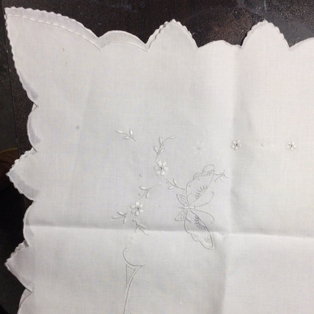 Approximately 34” square white on white embroidered linen tablecloth with butterflies and flowers. Small blue stain and two small burn holes. Fair vintage condition.