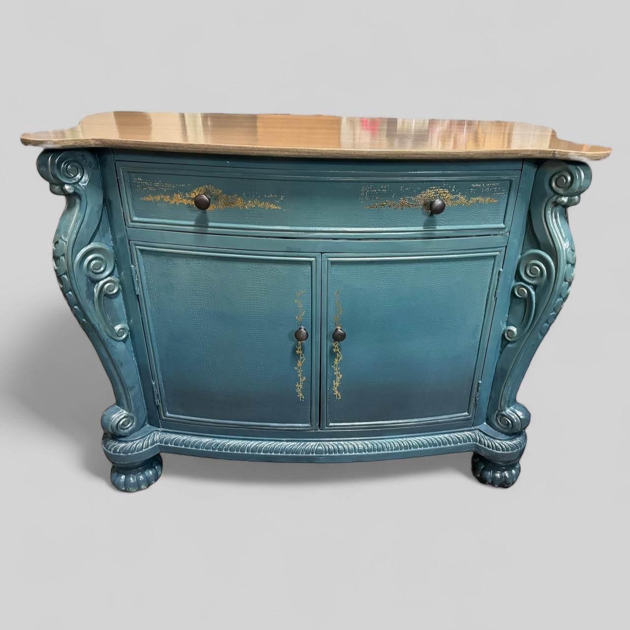 Restyled in beautiful Denim Blue and Metallics! Can be used for entry table, console table or buffet One drawer over 2 doors with shelf.