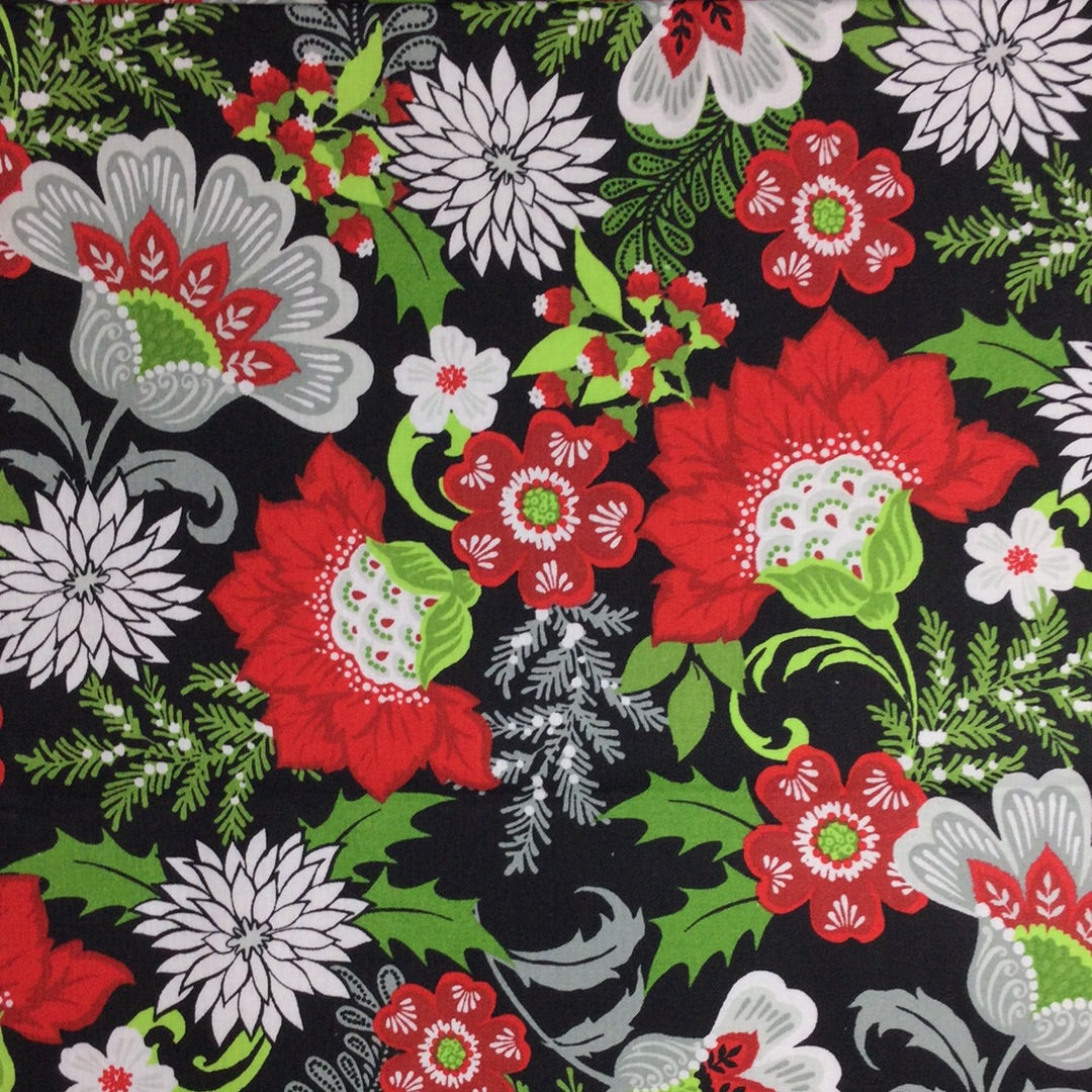Approximately 70”x 13 1/2” Red, green, white and black floral linen table runner. Like new.