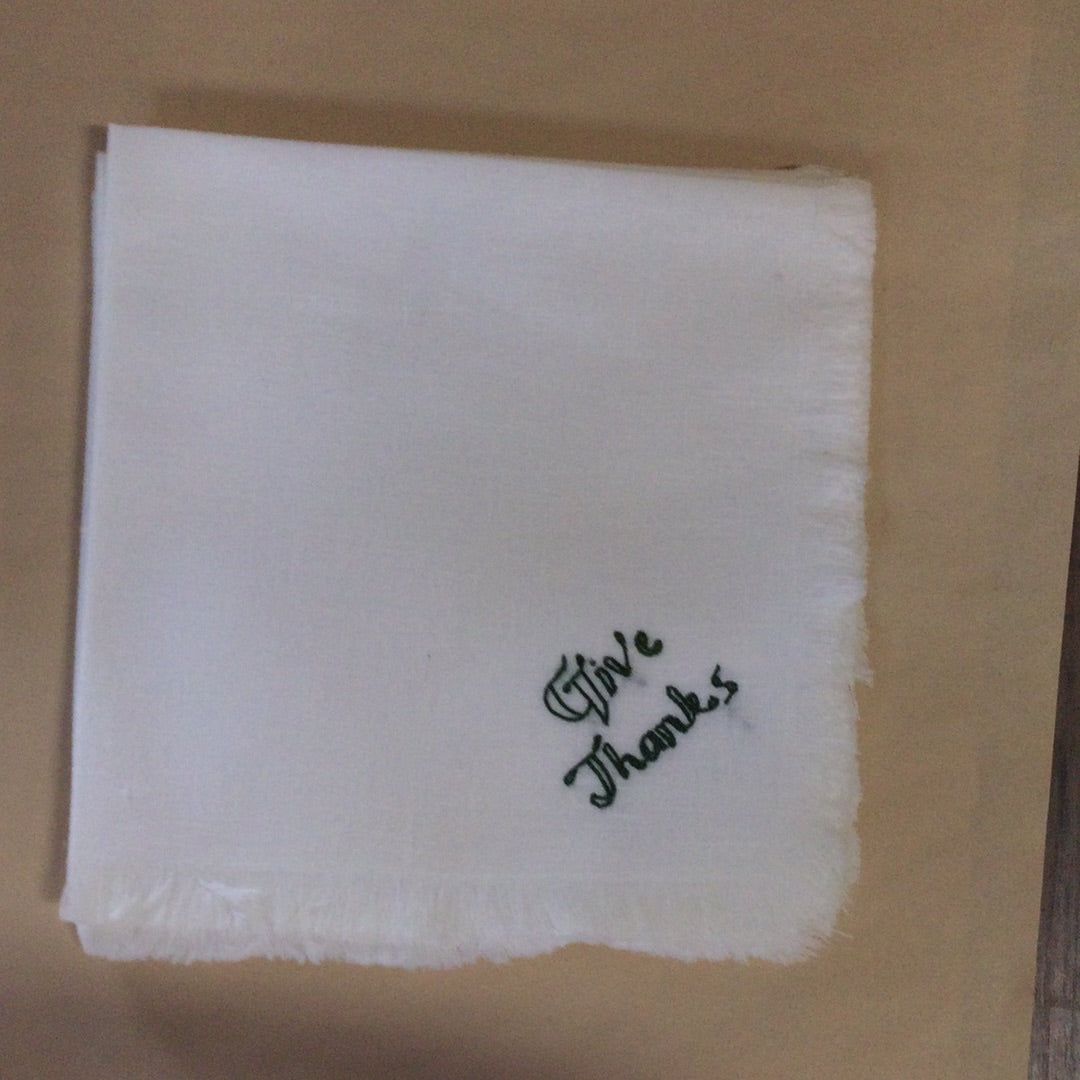 Set of 5 whiten linen dinner napkins embroidered with Give Thanks in green outline.