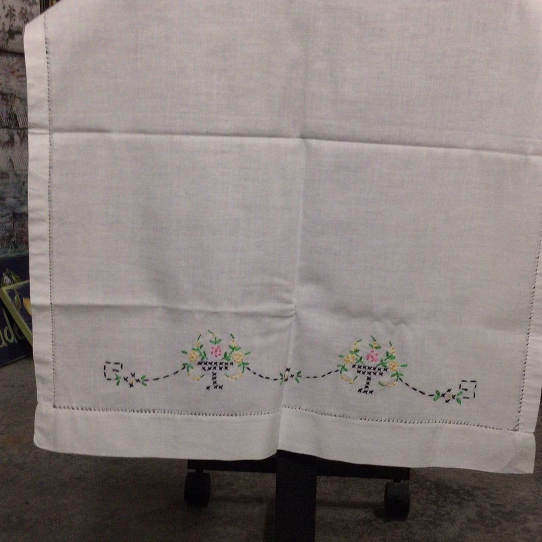 Approximately 18 1/2” x 46” white linen hand embroidered with yellow and pink bouquets. Good vintage condition.