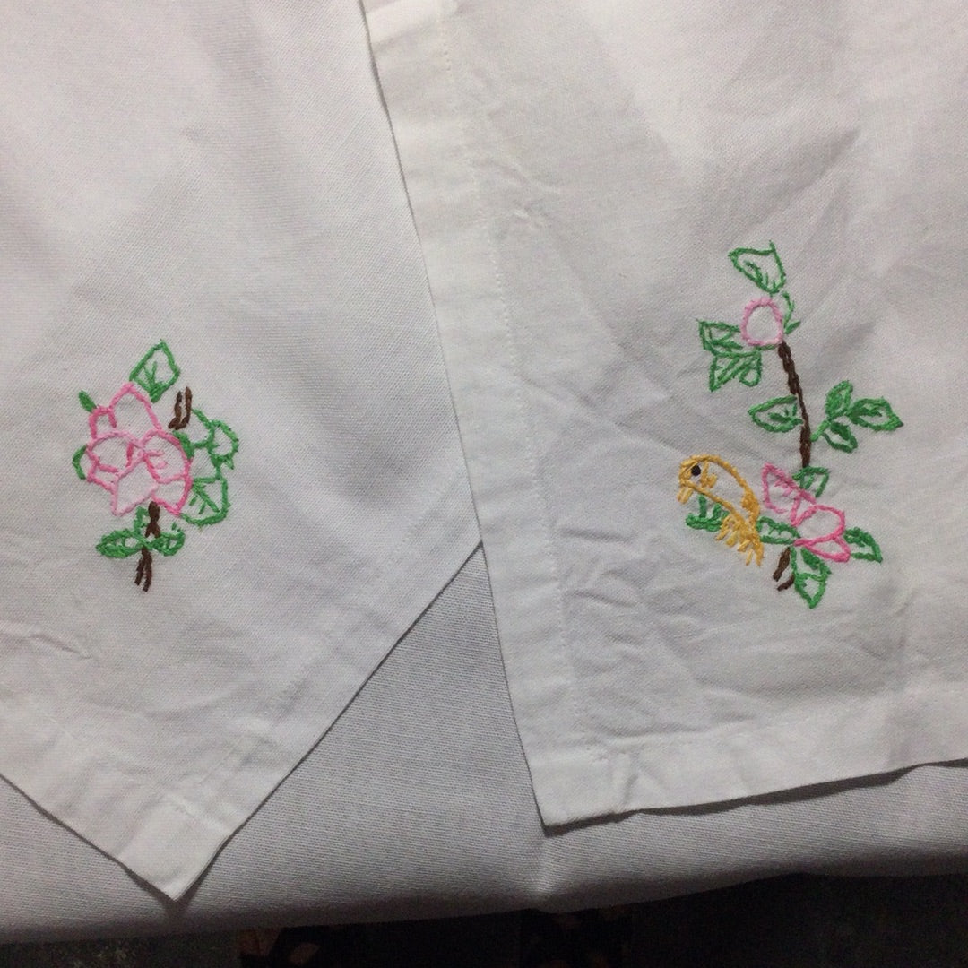 Approximately 35” x 42” white linen tablecloth with hand embroidered pink flowers in each corner. Lightly stained, fair vintage condition.