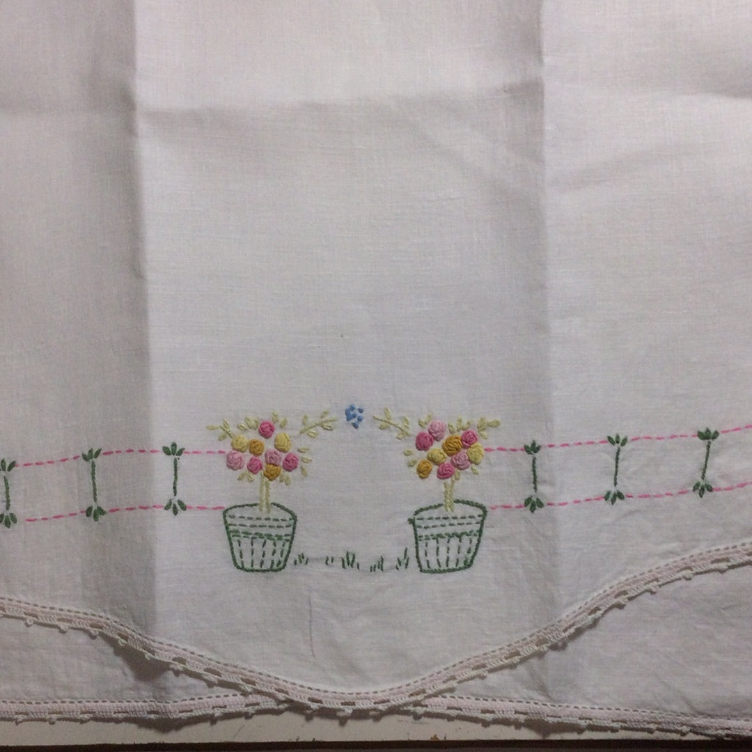 White linen tea towel with crocheted edge and hand embroidered fence and flowerpots. Very good vintage condition.
