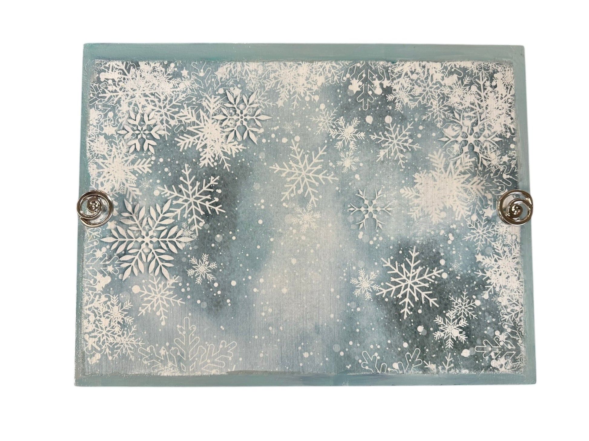 This beautifully Handcrafted Winter Blue Snowflake Serving Tray Riser adds a touch of elegance to any occasion. The winter blue color and delicate snowflake design evoke a sense of coziness and warmth, making it a perfect gift idea for the holiday season. The silver-tone wind-swirled handles add a touch of charm and functionality to this unique serving tray. Elevate your hosting game with this lovely winter-themed serving piece!