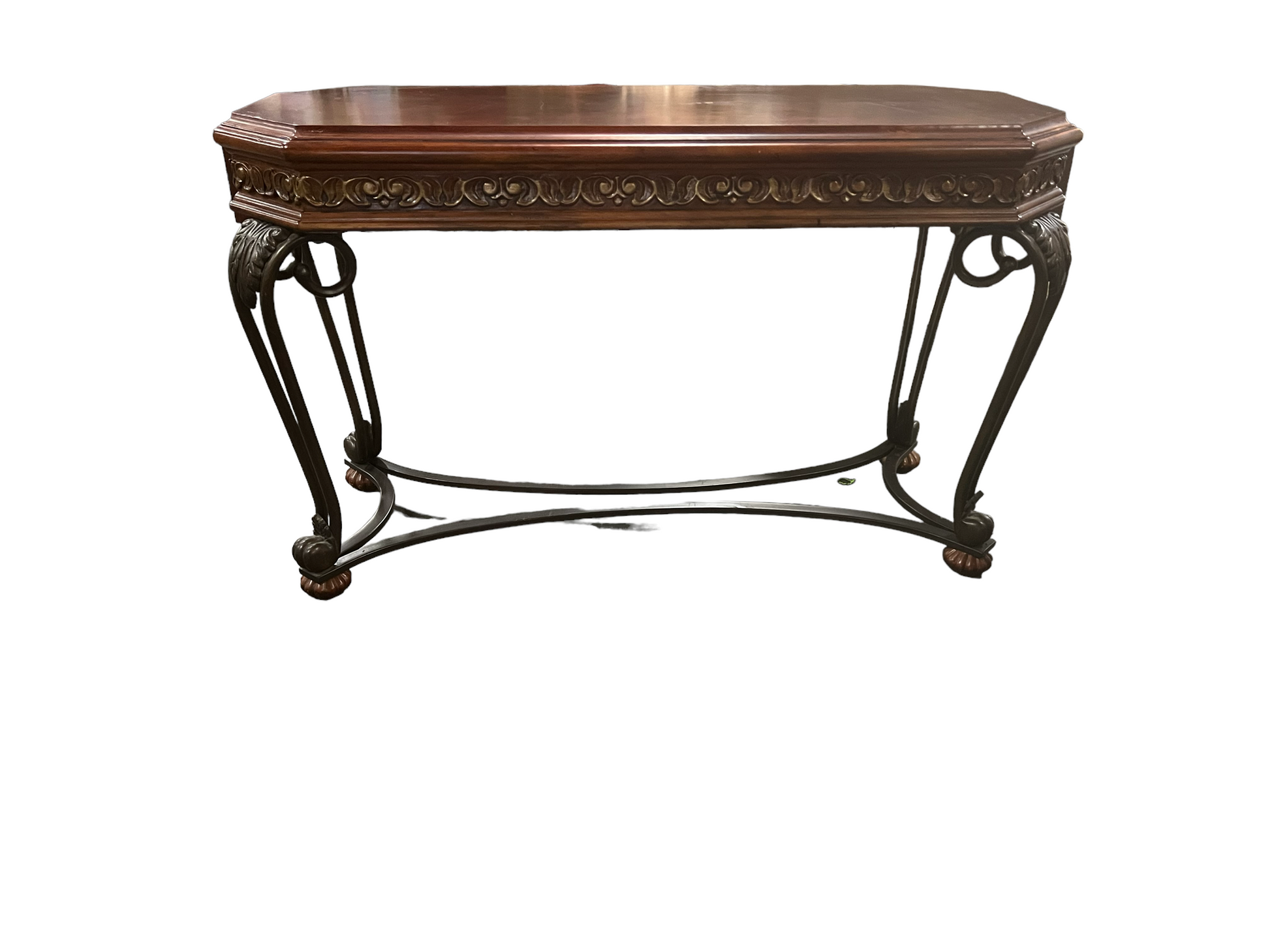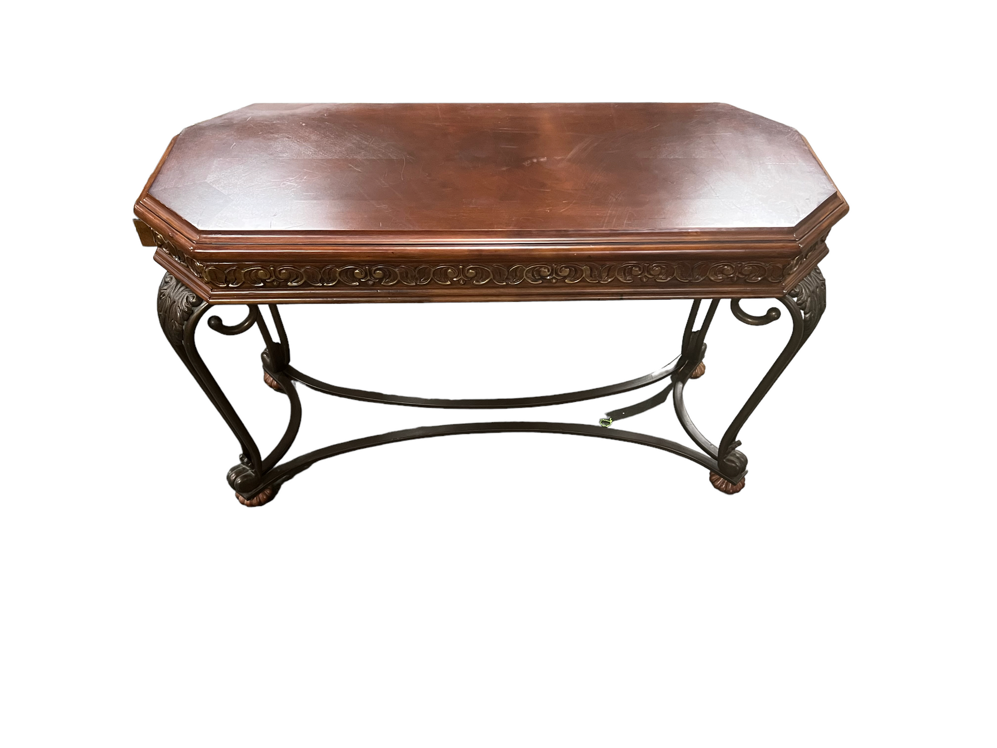 Iron & Wood Console or Entry Table Wood top; iron base; fluted wooden bun feet