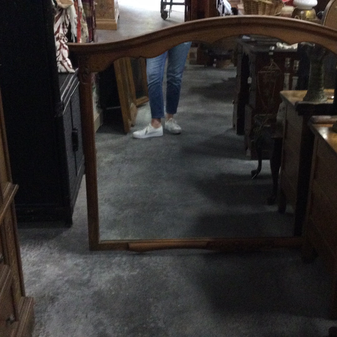 Large Framed Wall Mirror with Scroll Design on bottom.