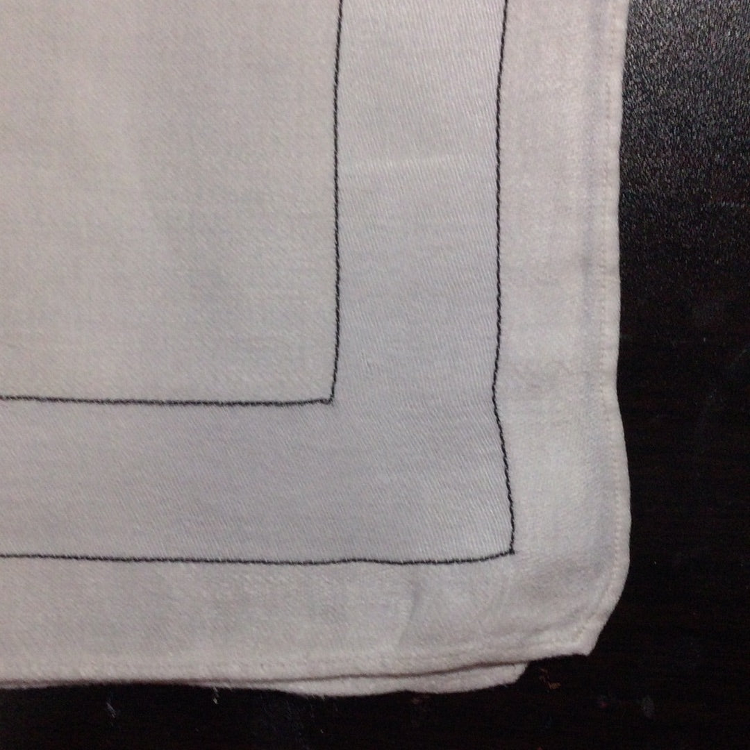 Approximately 15” square linen napkin with thin black stitched border. Very good vintage condition.