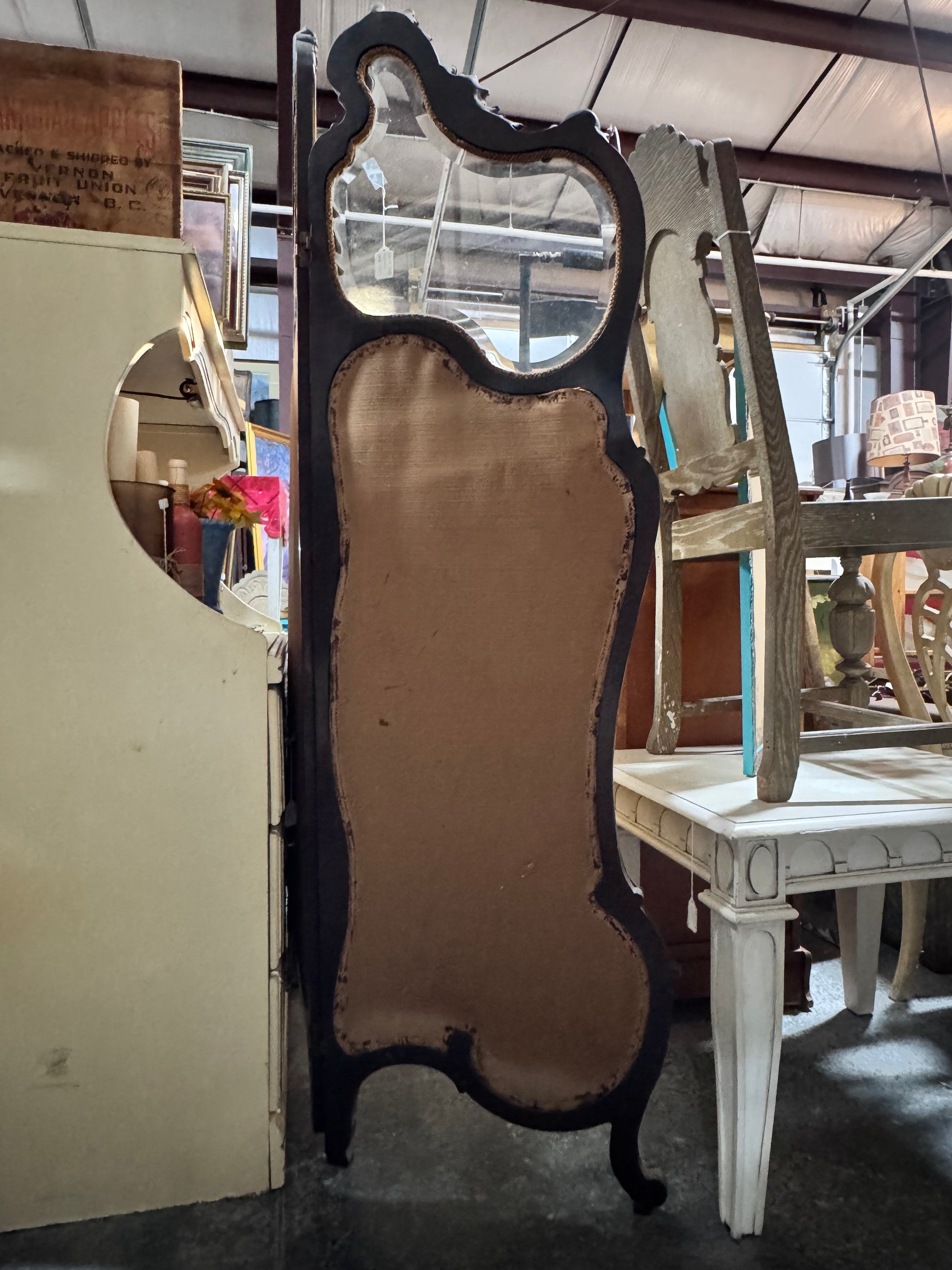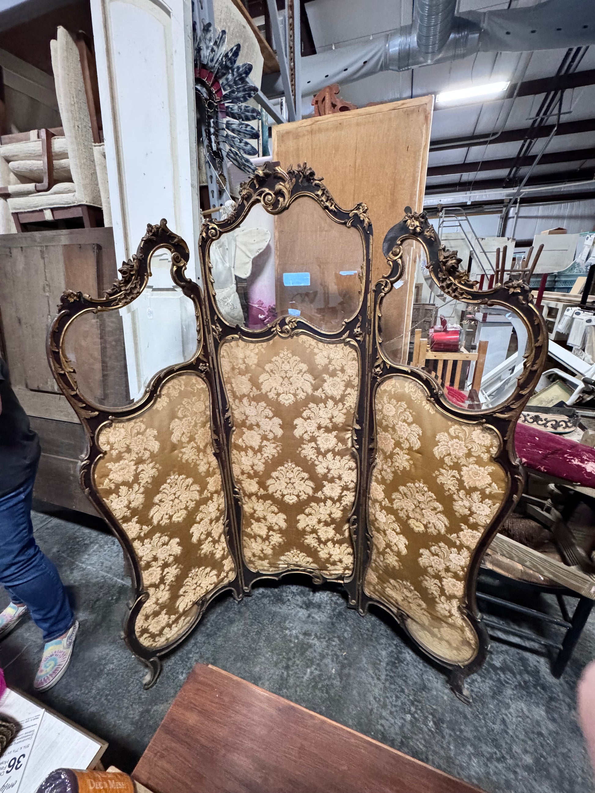 Louis XV Style Antique 3-Panel Screen ** Please note — there is a cracked glass panel on right; the ater stain on bottom right upholstery; there are some missing trim mouldings; center panel base is usable but does have small damage to underside approximately 1”-1 1/2” chip where dowel meets framework; pictures Will tell the story of this old but amazing panel! Priced accordingly