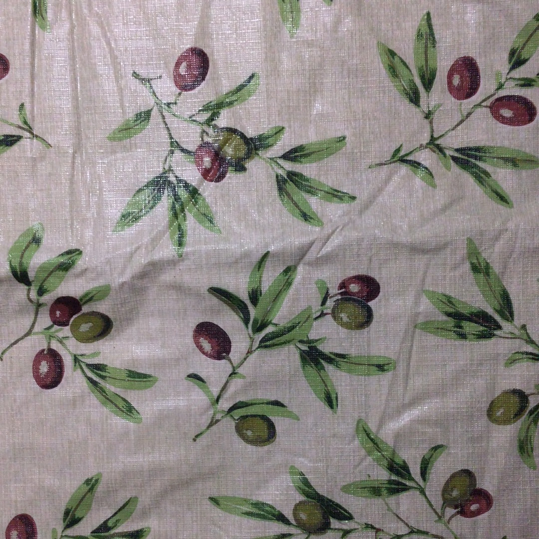 Approximately 60”x102” vinyl tablecloth with olives and leaves. Good condition.