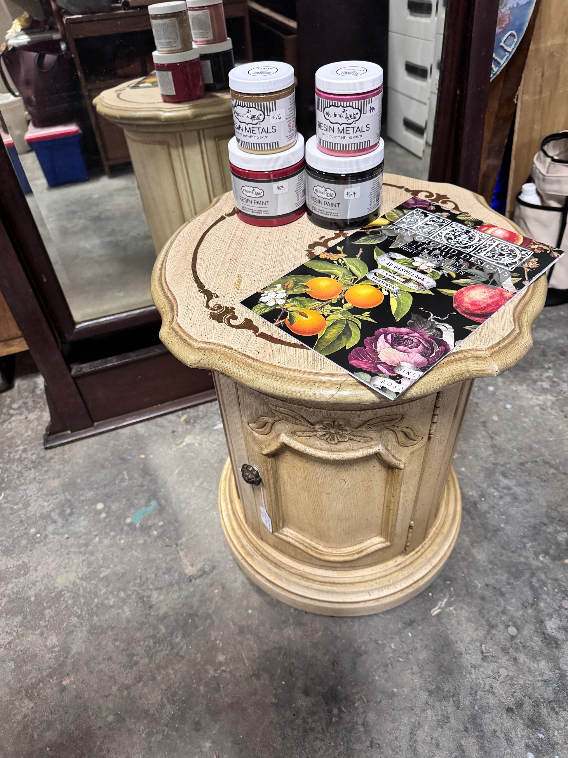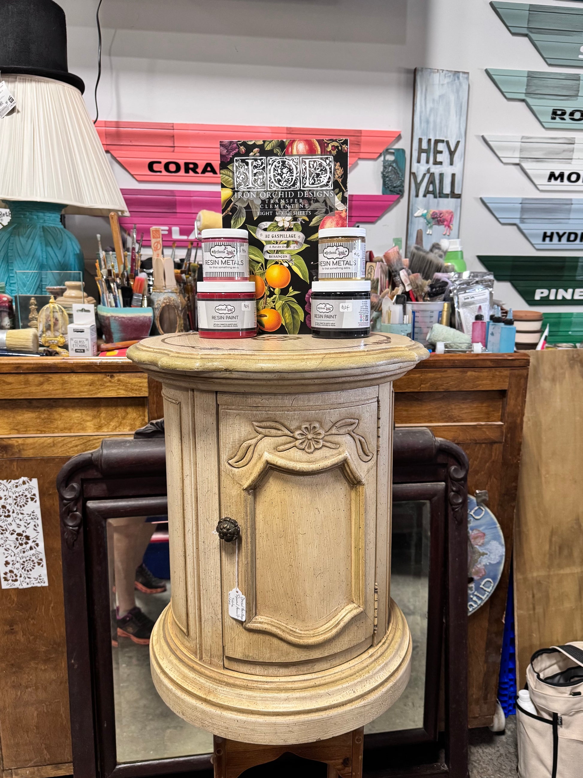 Here’s the whole bundle for the Paint-a-Long! Midnight, Ruby Red, Classic Gold Metallic and Golden Red Metallic paints (don’t forget the Prep!) and the IOD Clementine transfer set. Of course, the cabinet, too!