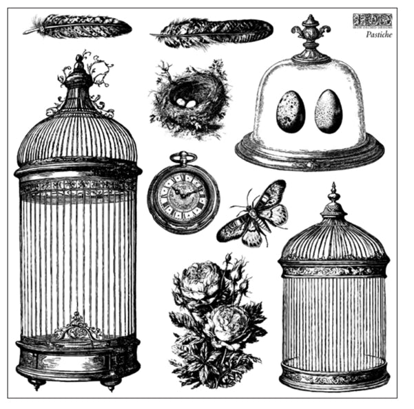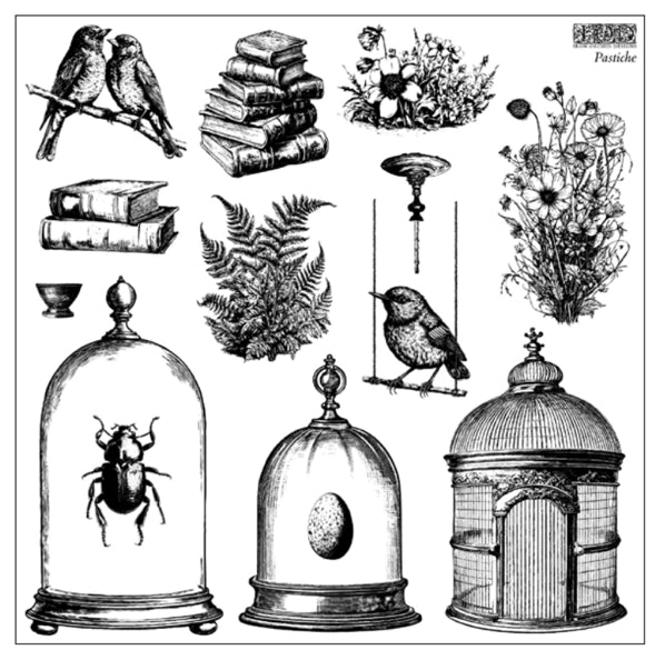 Cloches, bird cages, birds and books, oh my! Two amazing 12” xx12” stamp sheets