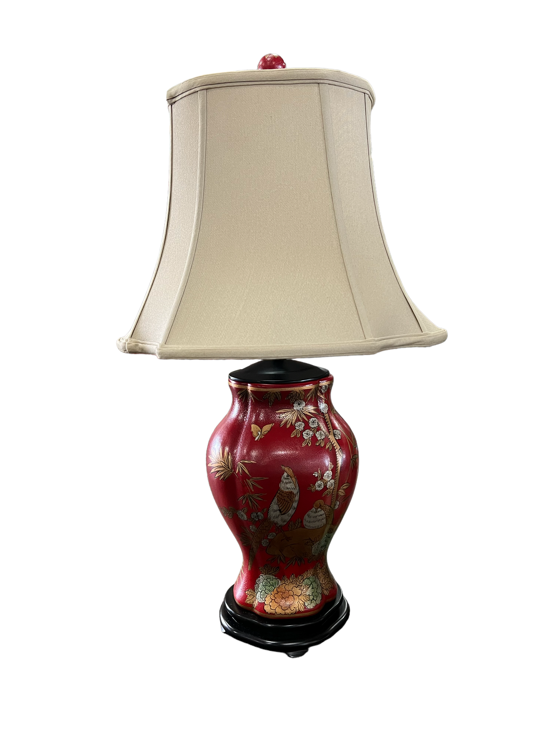 Pheasant and Flower Chinese Red Lacquer Table Lamp - tested