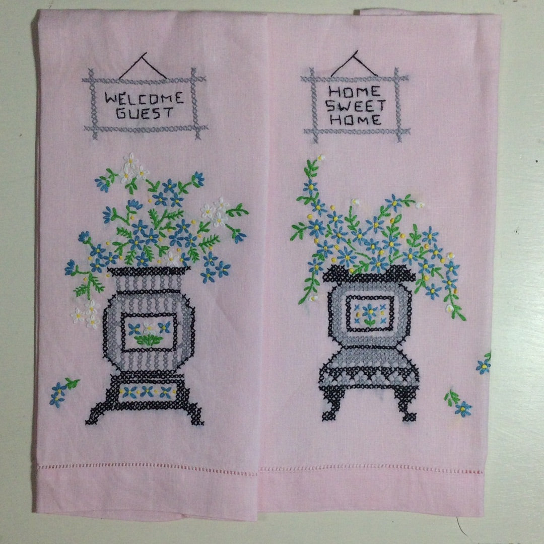 Set of two pink linen tea towel with cross-stitched stove and embroidered flowers.