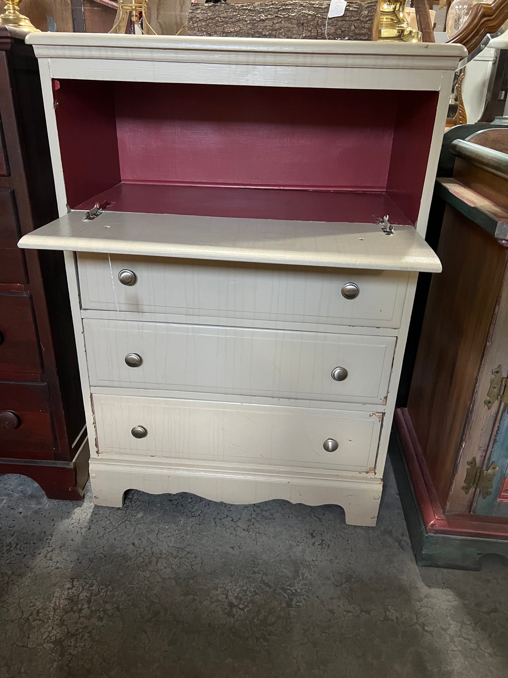 Secretary on top; 3-drawer chest on bottom. This one came in painted and could use a spruce up! Fantastic for a dorm, apartment or child's bedroom!