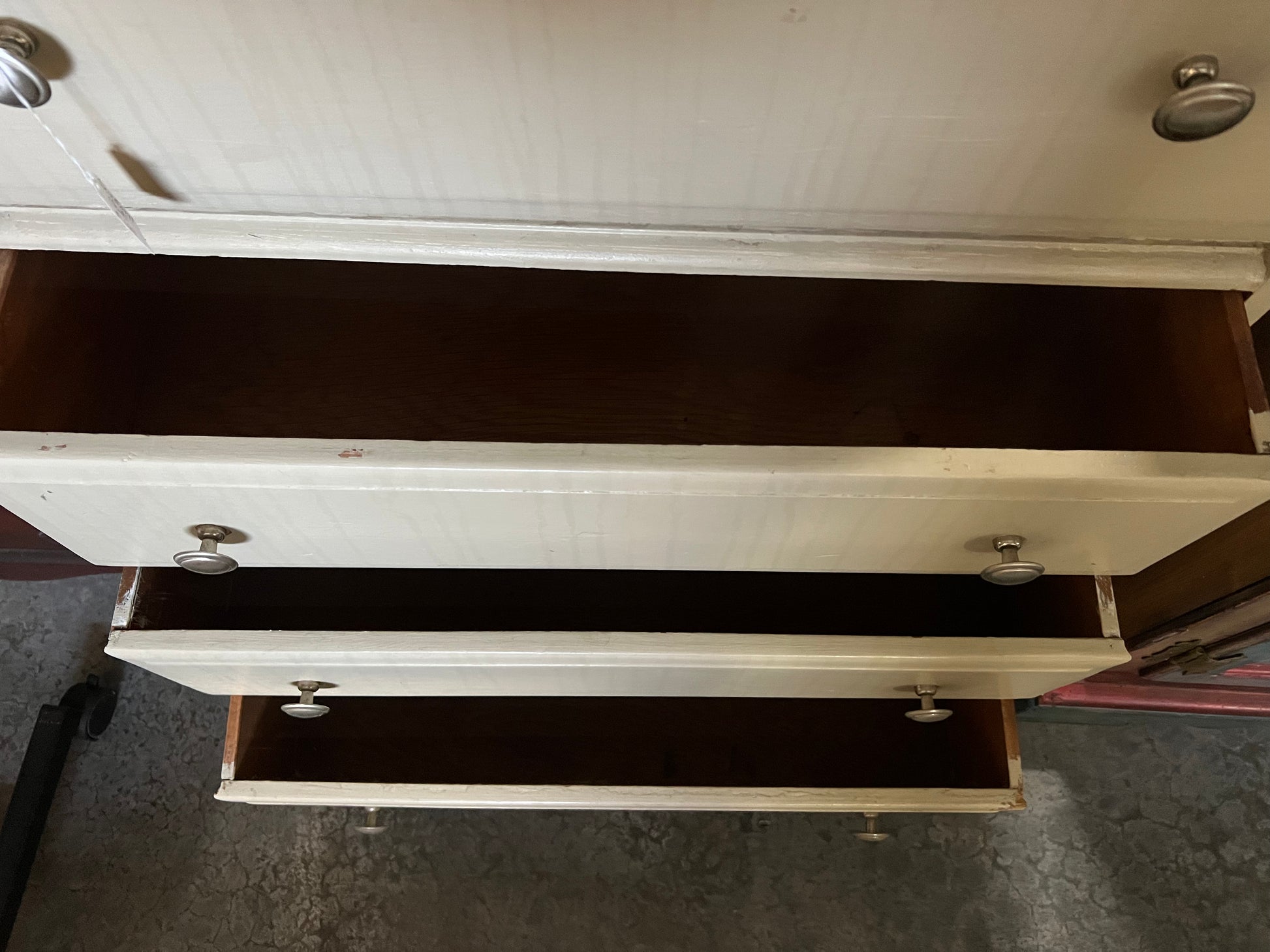 Dovetail construction drawers appear to have some prior repair work, however, all are in good working condition. No structural issues. In good vintage condition.