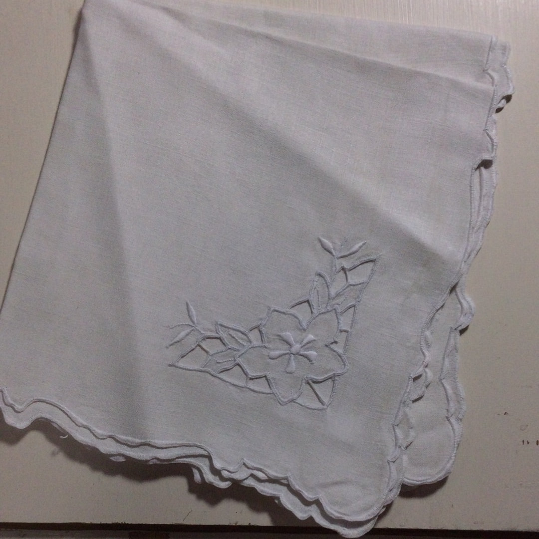 Set of 2 white linen dinner napkins with embroidered edges and cut out flower in corner. Very good vintage condition.
