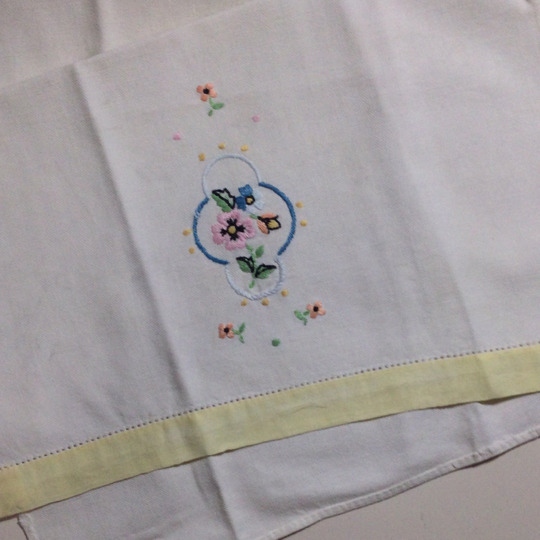 Set of 2 white linen luncheon napkins with yellow edge and embroidered flowers. Tiny stains. Good vintage condition.
