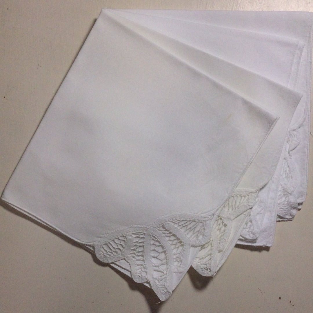Set of 4 white linen dinner napkins with lace corner. Small stain on one napkin. Very good vintage condition.
