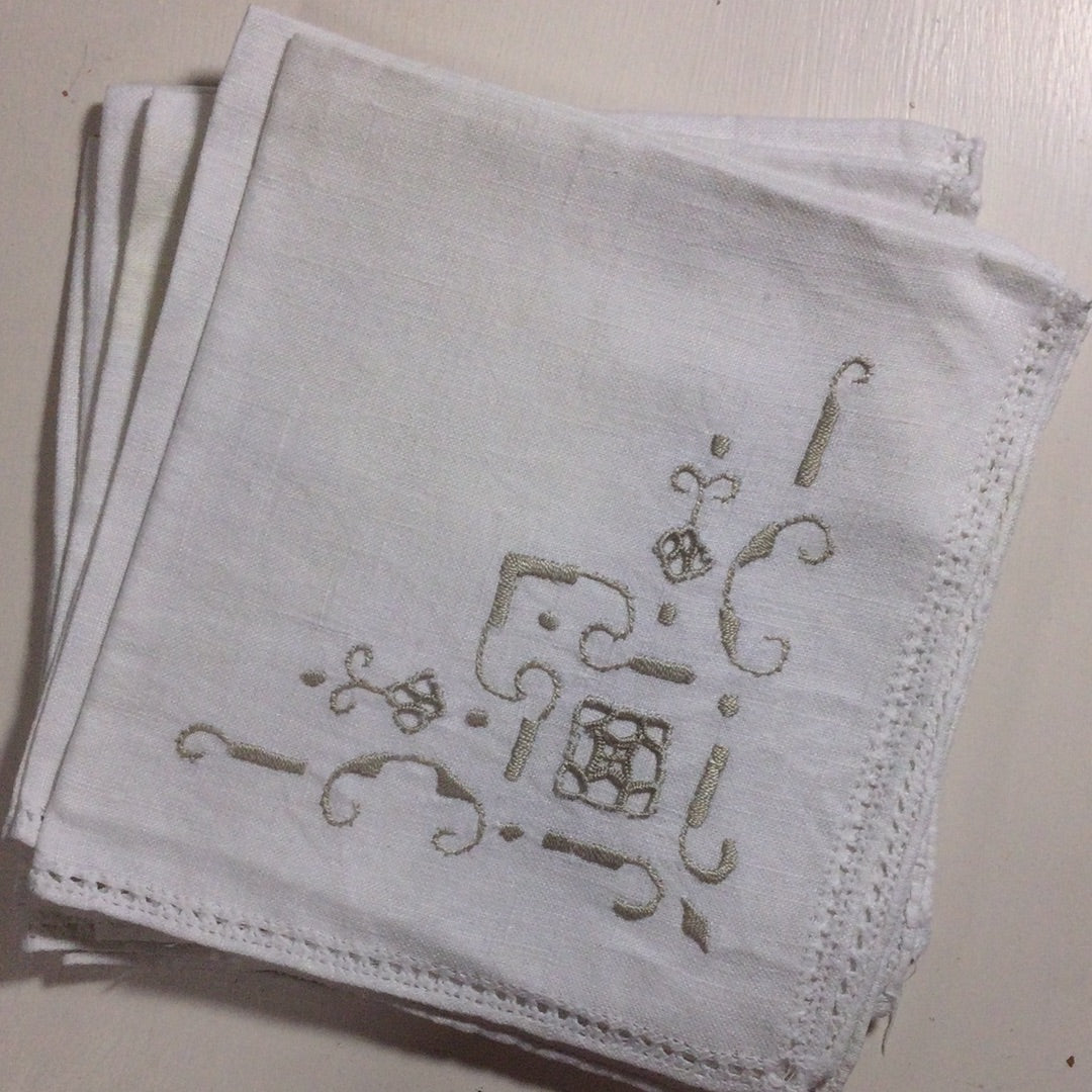 Set of 5 cream linen dinner napkins with detailed edges and embroidered taupe design. Some yellowing on one napkin, very good vintage condition.