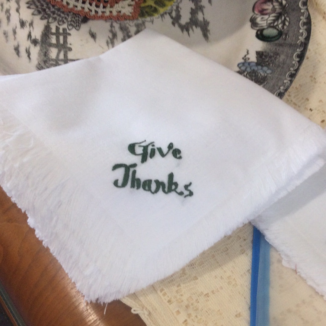 Set of 4 white linen napkins with Give Thanks embroidered in green. Measures approximately 15” w x 14” t