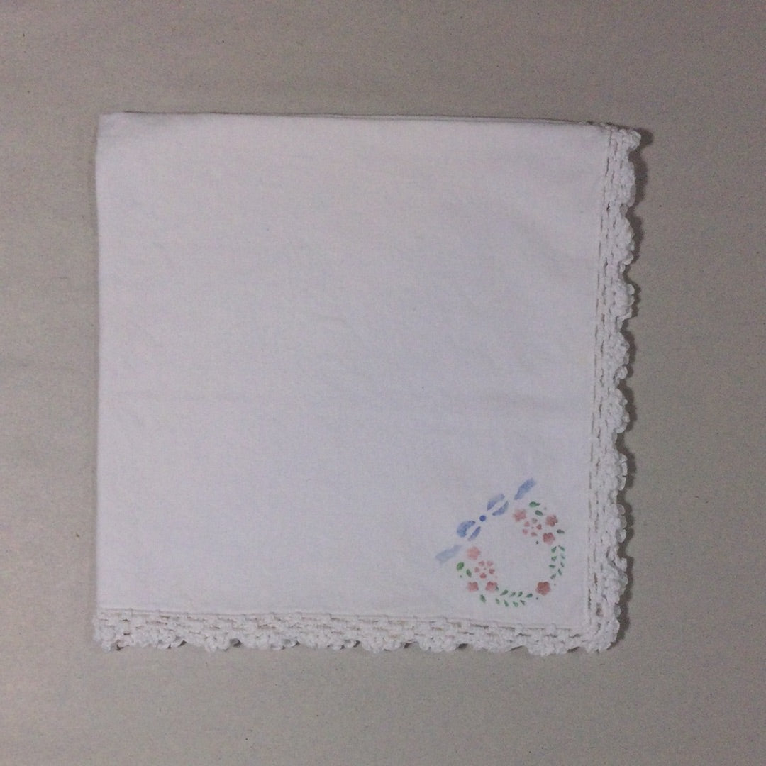 Approximately 18” square linen dresser scarf with crocheted edge and painted stenciled wreath. Good vintage condition.