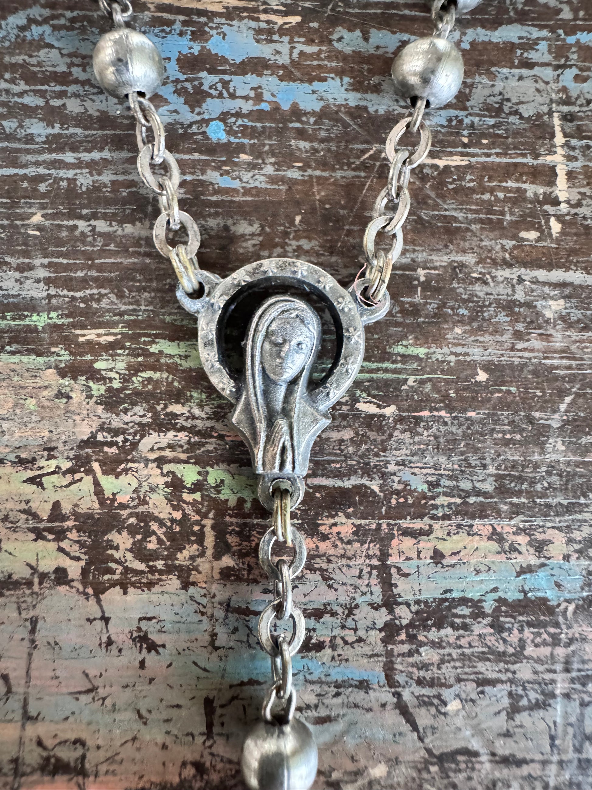 This exquisite vintage rosary is crafted in sterling silver with finely detailed faceted beads and a traditional crucifix. At the center of the cross is a rare Stanhope micro-image lens, a tiny hidden devotional scene only visible when viewed through the miniature peephole. These remarkable Stanhope rosaries were treasured Catholic souvenirs from pilgrimages during the late 19th and early 20th century.