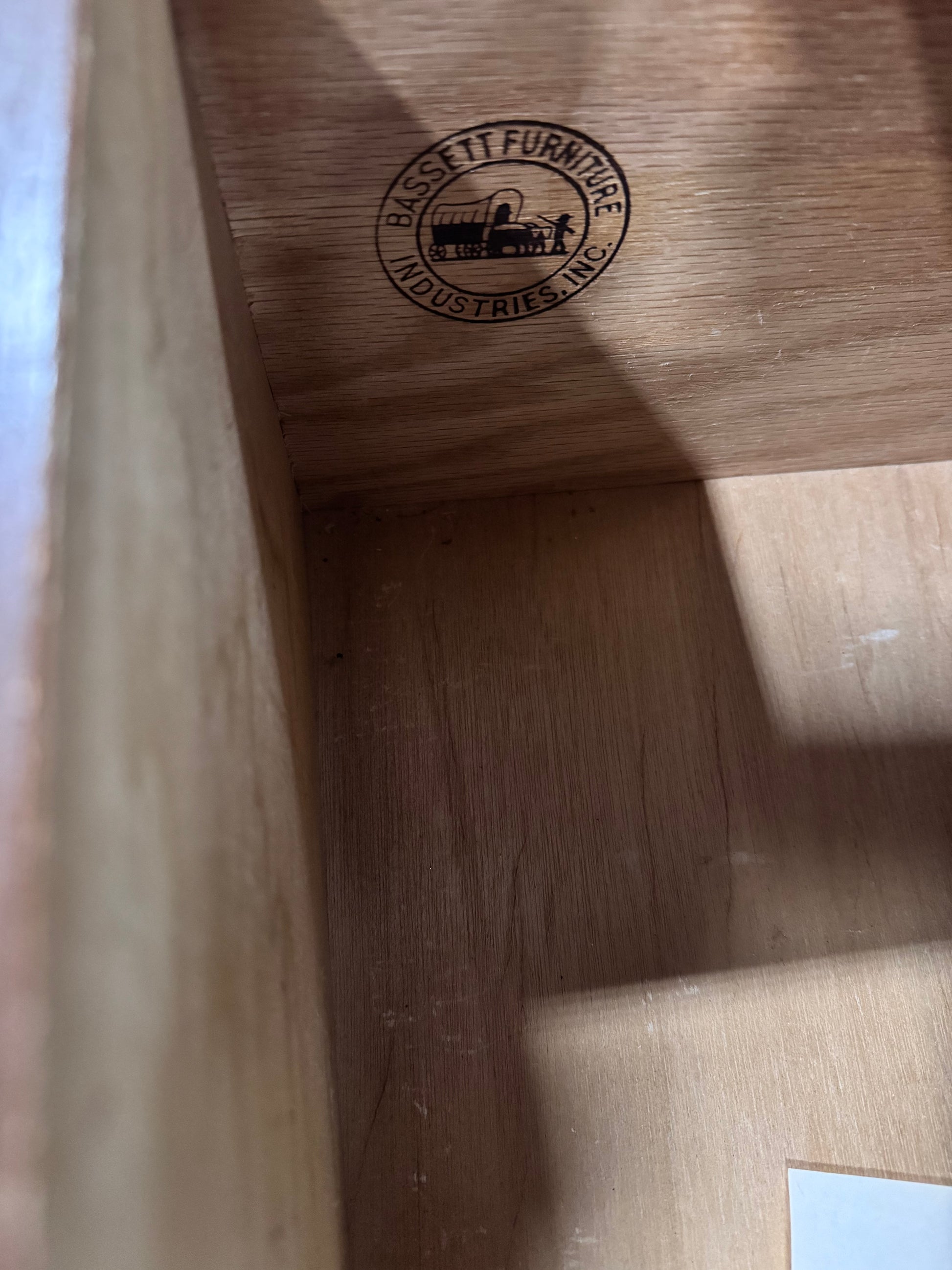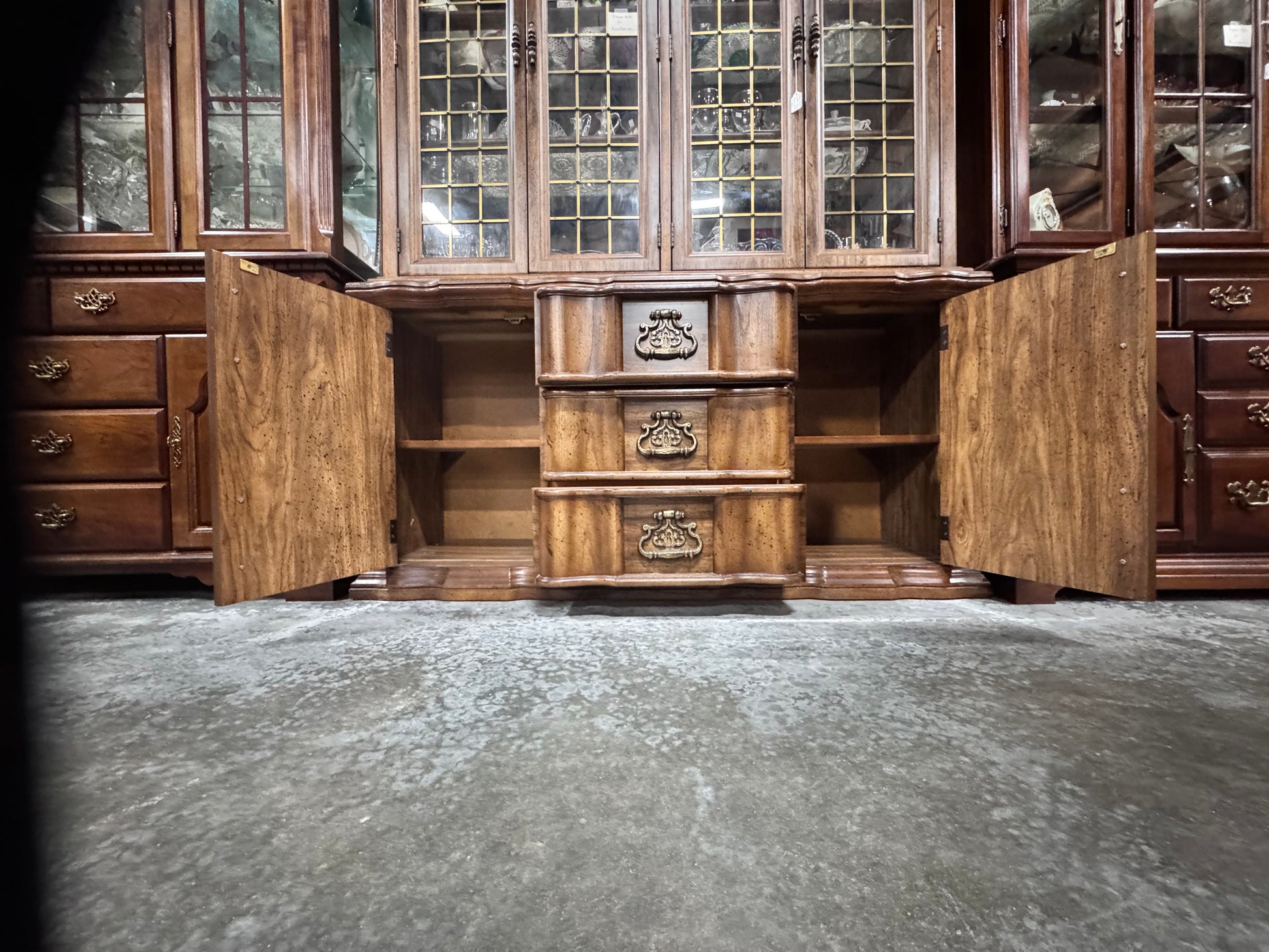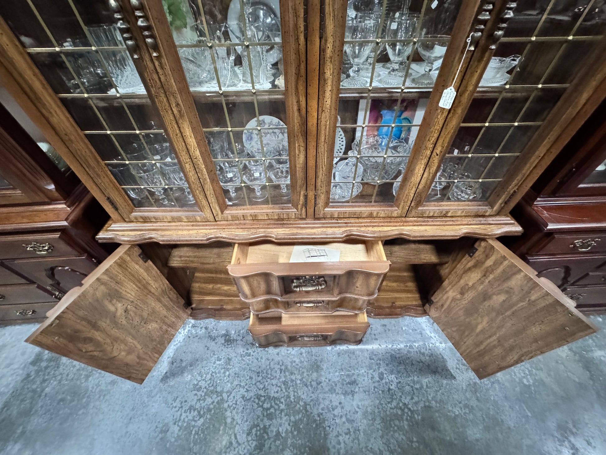 Vintage Basset China Cabinet 2-piece construction with 4 upper doors, 2 lower doors and 3 drawers 2 glass inset shelves with single plate rail