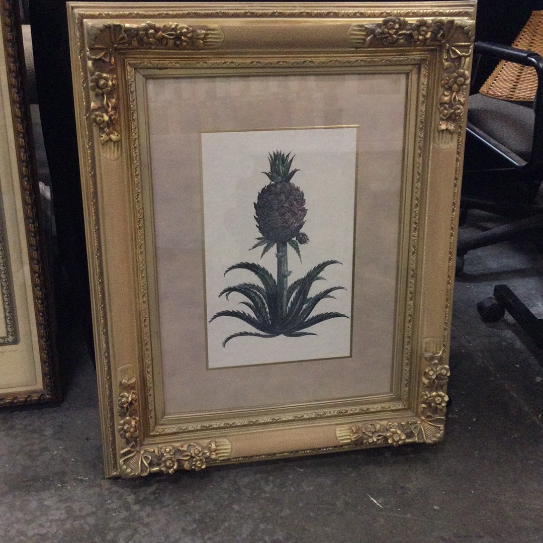 Approximate dimensions: 27” w x 33” t Printed lithograph of the southern symbol of hospitality, the pineapple plant in a warm silvery wood frame with carved flowers.