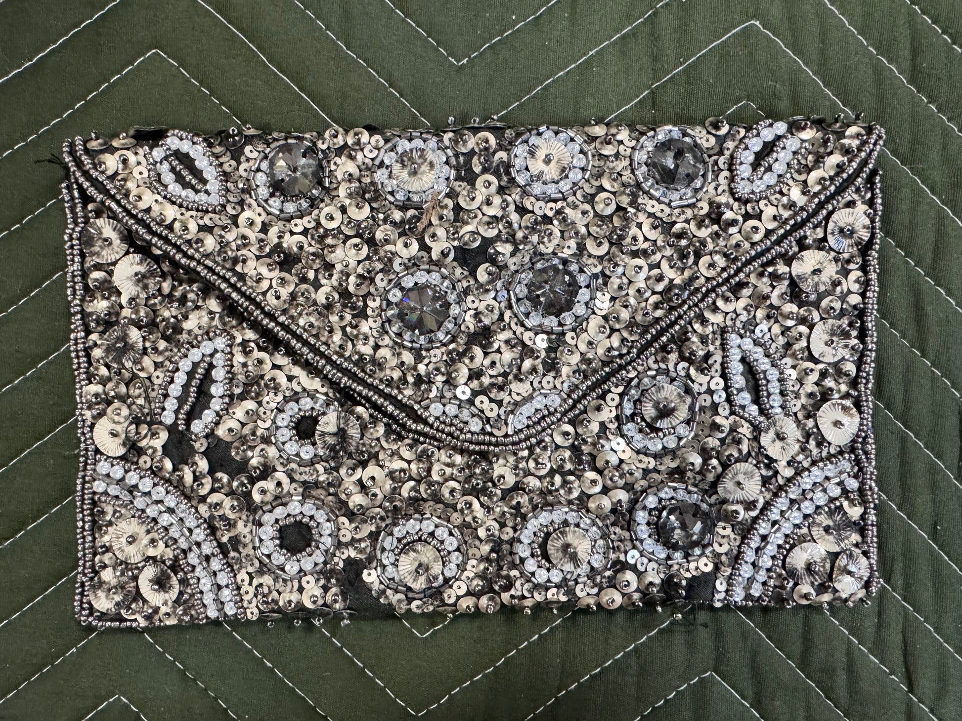 Vintage Silver and Black Beaded Sequined Clutch Evening Bag NOTE missing or loose beading