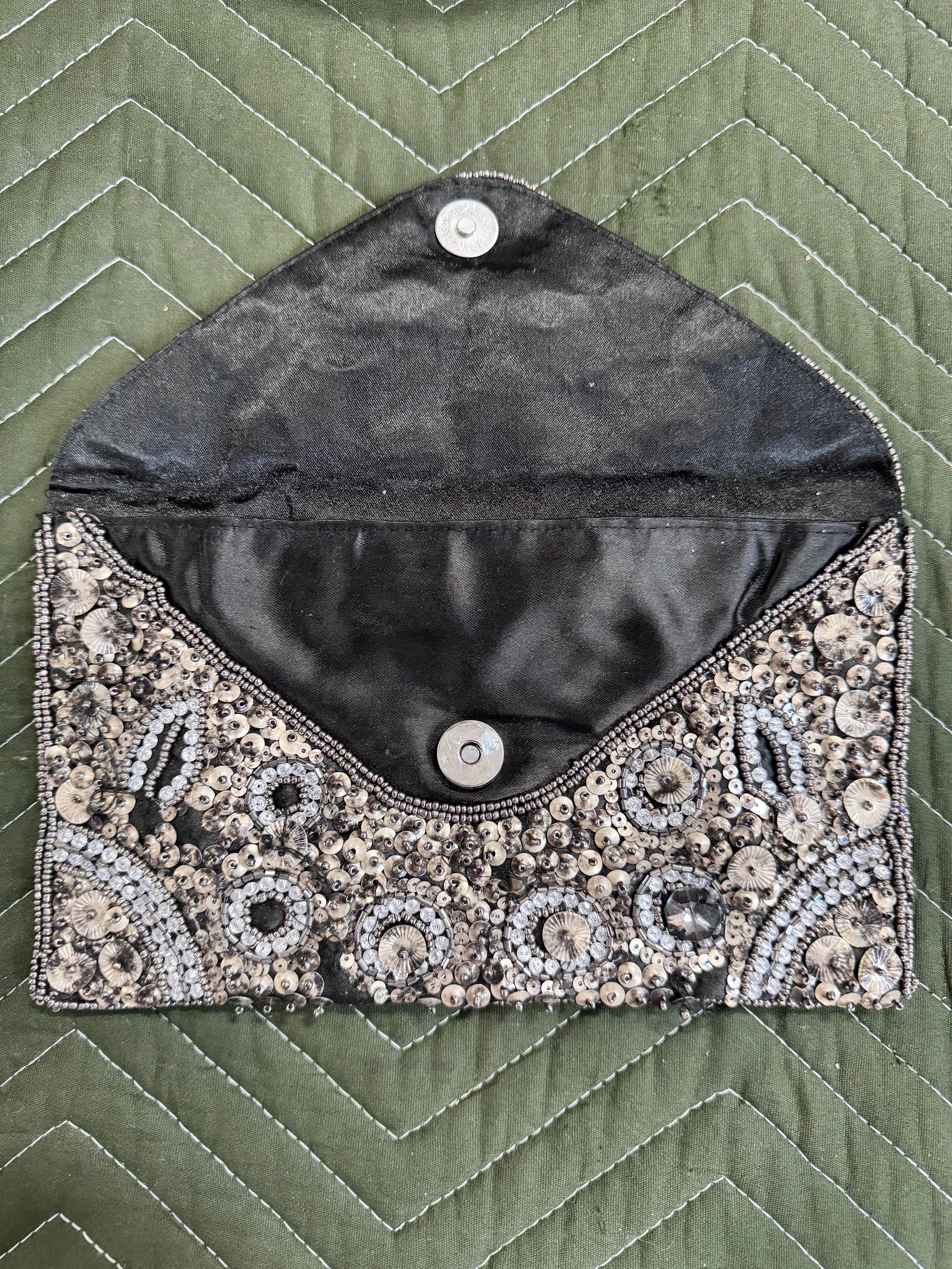 Vintage Silver and Black Beaded Sequined Clutch Evening Bag